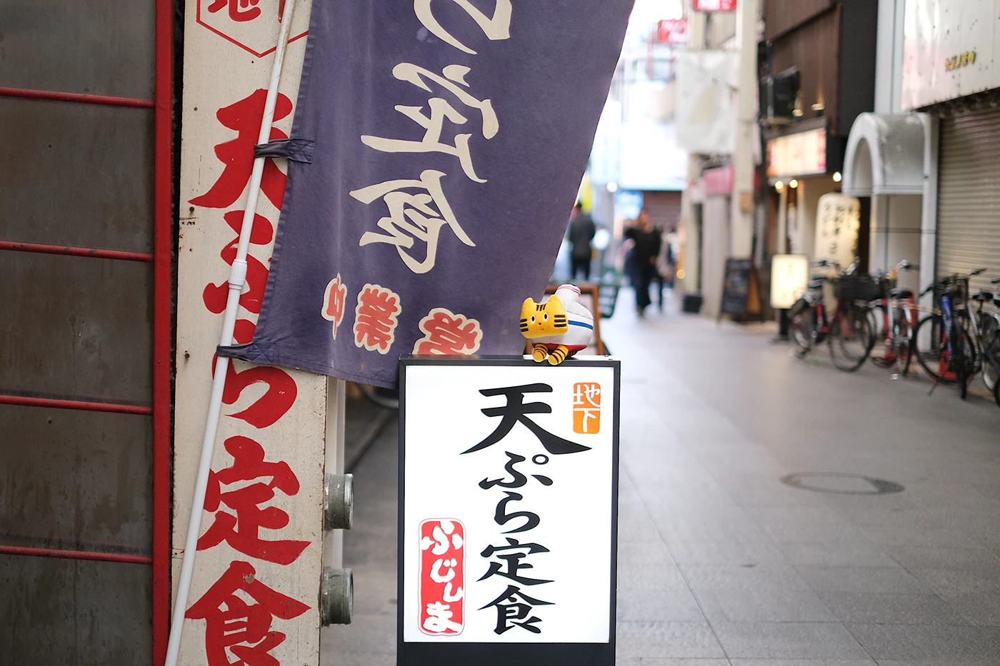 小倉駅から魚町銀天街を歩くこと約2分。「天ぷら定食」と書かれた看板とのぼりを見つけました。どうやら地下にお店があるようで、興味津々のふねこたちは階段を降りていきます。