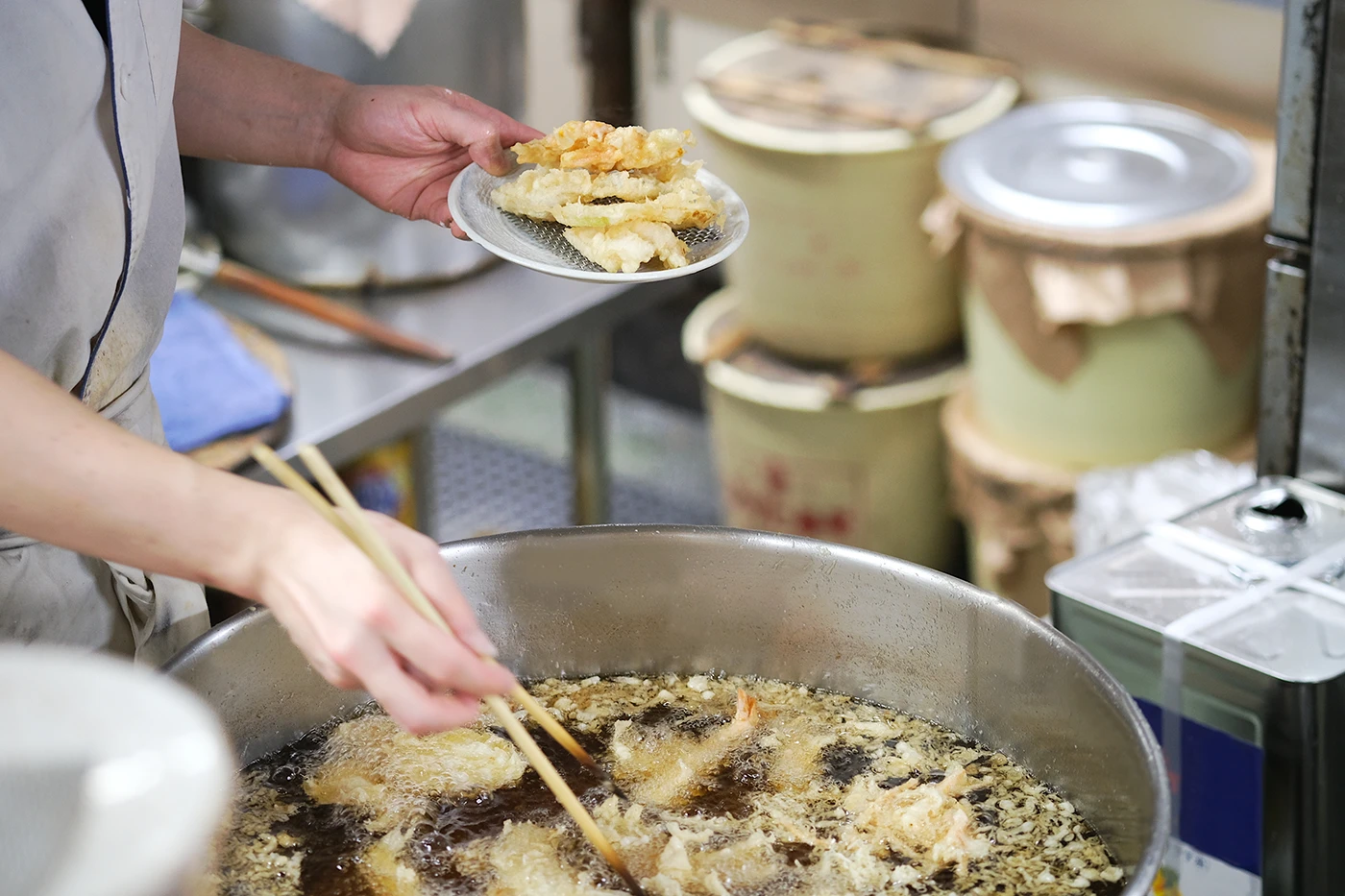 地下へと続く細い階段の先に広がるのは、「ジューッジュワジュワ…」「チリチリ…」という天ぷらが揚がる音と、コの字型のカウンター席。昭和の香りが漂う『天ぷら定食 ふじしま』は、”安い、早い、おいしい”を合言葉にした天ぷら専門の食堂。通称「地下天(ちかてん)」と呼ばれ、朝10時の開店直後から賑わい、地元民から観光客まで、ひっきりなしに人が訪れる小倉の名店なのです。