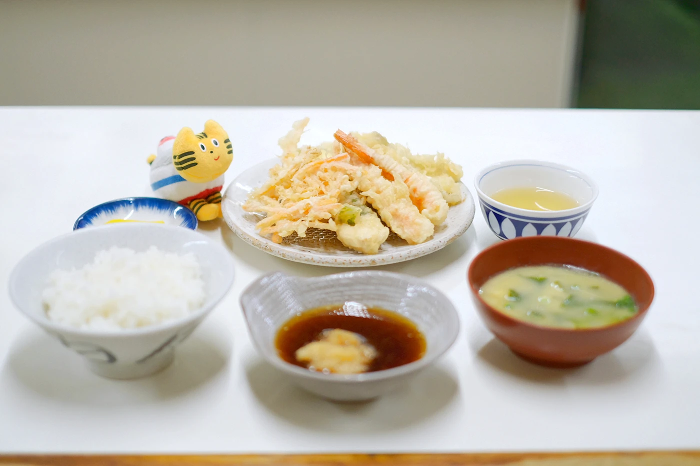 「海老天付天ぷら定食」は海老2本に、キスと白身魚、ささ身が1本ずつ、そして4種類の野菜天がセットになった、9品盛り!サクサクッと軽やかな衣の食感に、ふねこの尻尾もピンと立ちます。一口かじれば、海老のプリプリ感と衣の歯触りが絶妙なハーモニーを奏で、つゆとの相性も抜群。甘めの白味噌仕立ての味噌汁も、ほっこりやさしい味わいです。