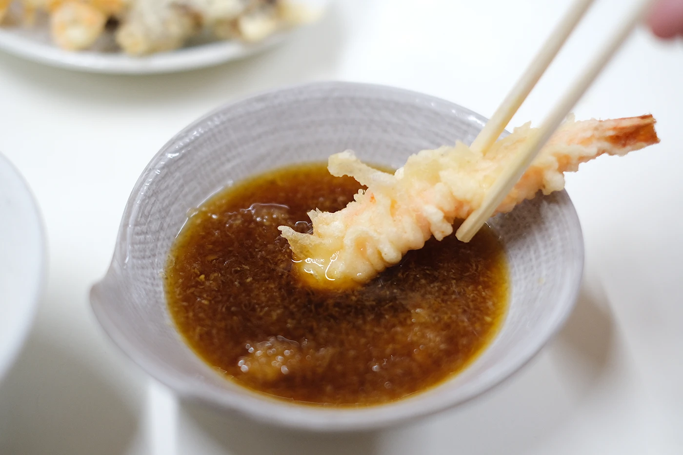 「海老天だけの天ぷら定食」はひとまわり大きいエビを使った天ぷらを5本堪能できます。海老の旨味と食感を贅沢に味わえ、カリカリの尻尾までおいしくいただきます♪