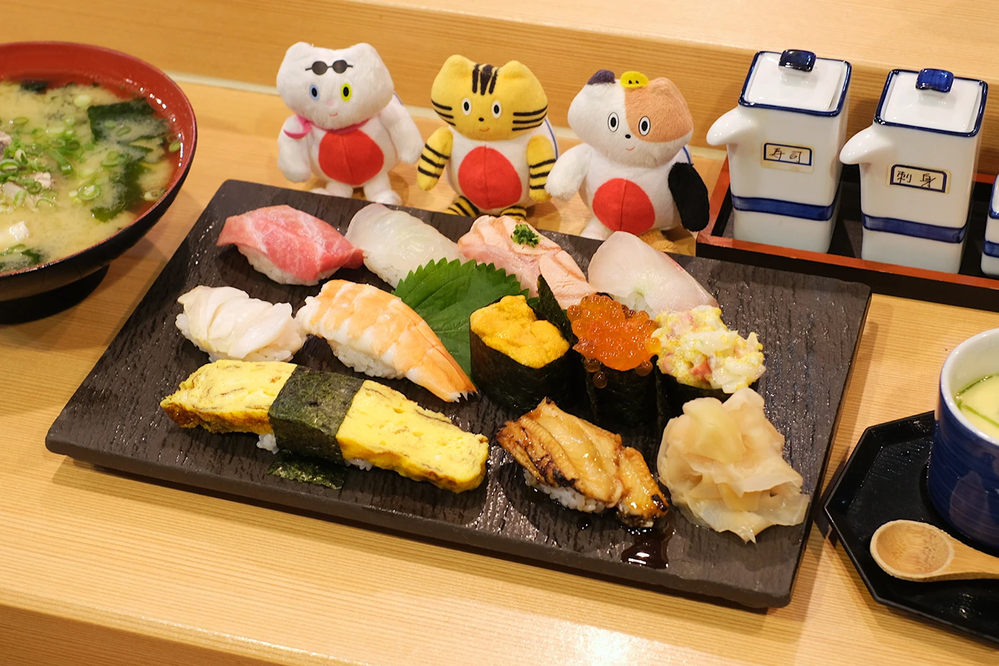 注文したのは、上にぎり寿司ランチ(3,000円)。運ばれてきた握りを見て、目をキラリと輝かせるふねこたち。大トロ、ウニ、イクラ、海老、穴子、炙りサーモン…一貫一貫のネタが大きくて見た目も美しい~!西港町にある北九州市中央卸売市場から仕入れる魚介類はどれも新鮮で、厚みのあるネタが舌の上でとろける贅沢な味わい。