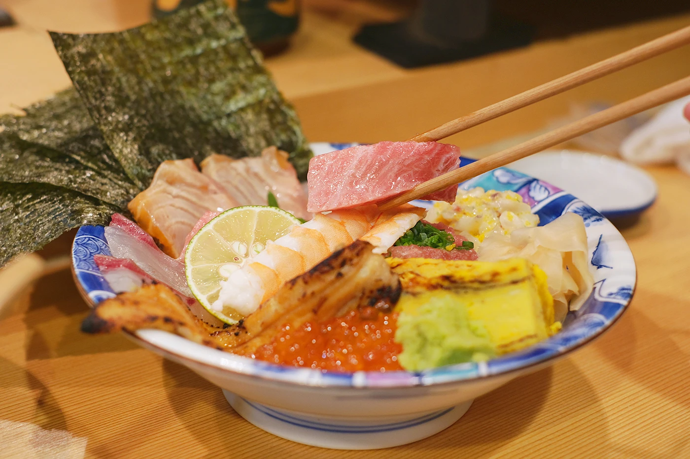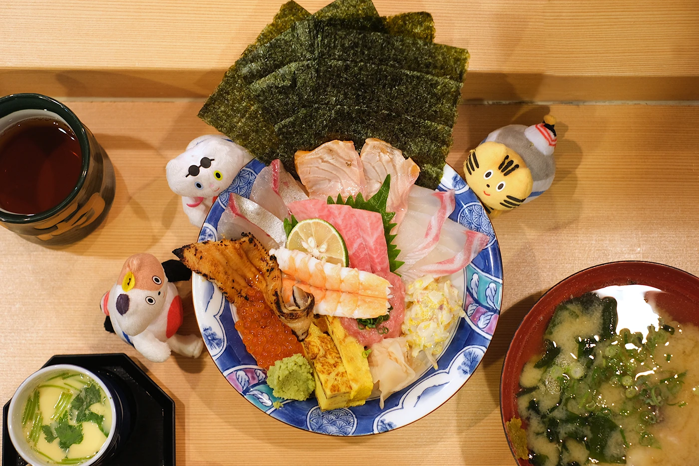 いろいろな味わい方を楽しめる海鮮丼ランチ(2,500円)もチェック!10種類ほどのネタが惜しみなく盛り付けられ、視線が釘付けになるほどボリューム満点。海苔で包んで手巻き風にしたり、そのまま豪快に味わったり、口いっぱいに広がる海の香りと旨味に、無我夢中になっちゃいます。