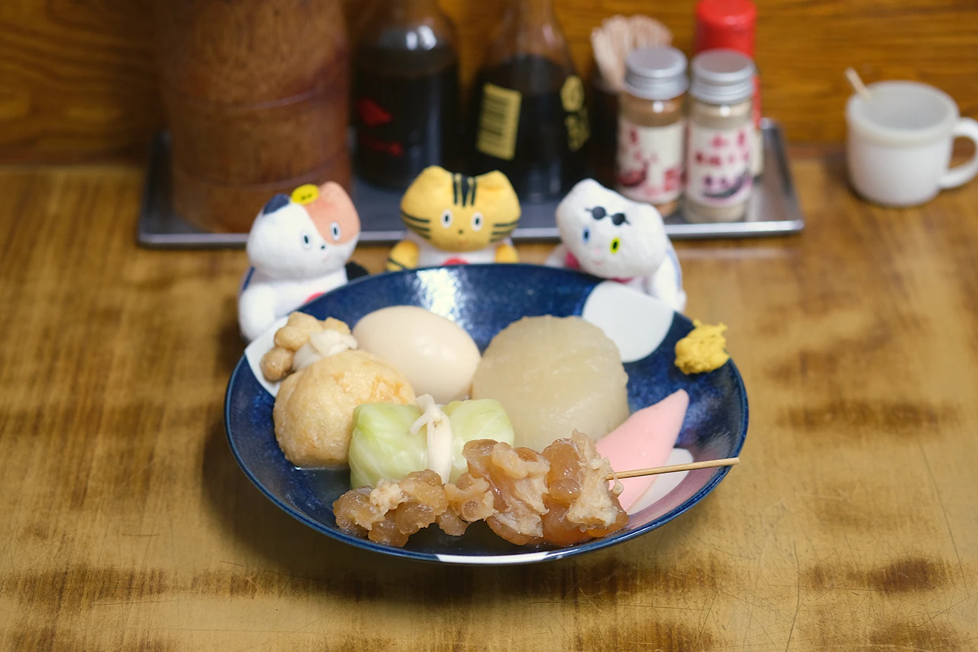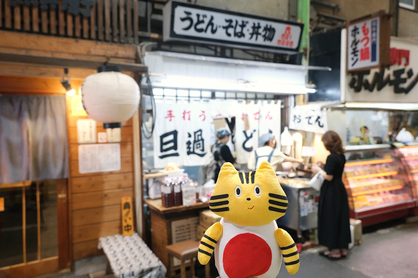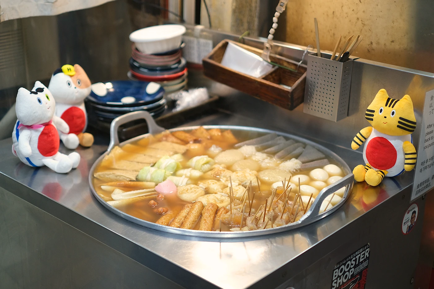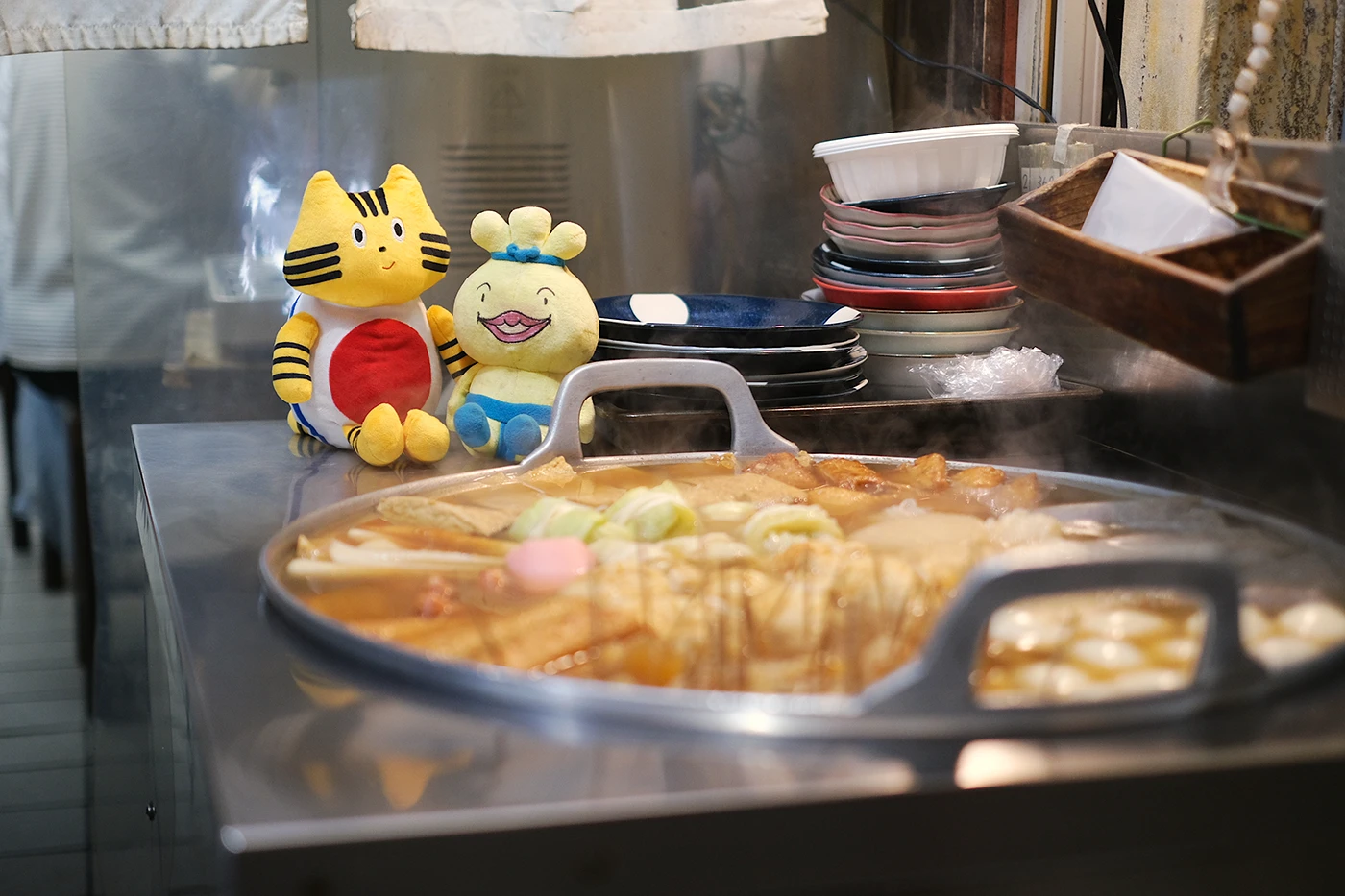 鮮魚や野菜、惣菜の香りが入り混じった市場特有の匂いに、ふねこの鼻がピクピク。約100店舗が軒を連ねる中、まず立ち寄ったのは『旦過うどん』。店頭の大鍋でグツグツ煮込まれるおでんの香りに誘われて、思わず足が止まったようです。
