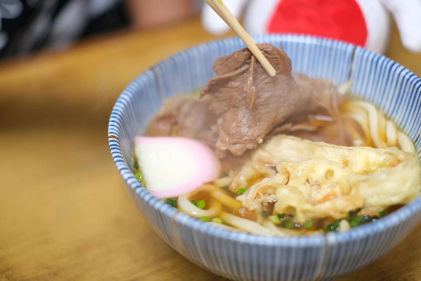 せっかくなので、人気の肉ごぼう天うどん(650円)もいただきましょう!隣の精肉店から仕入れる新鮮な牛肉を厚切りで使用し、驚くほど柔らかく仕上げています。コシのある手打ち麺とサクサクのごぼう天も最高~!