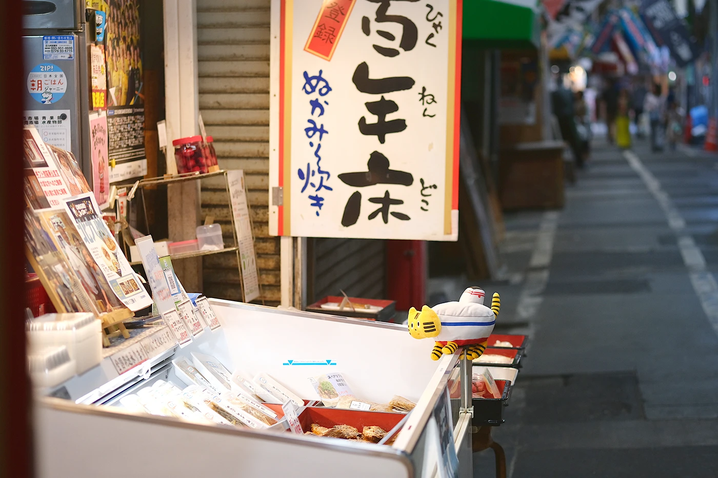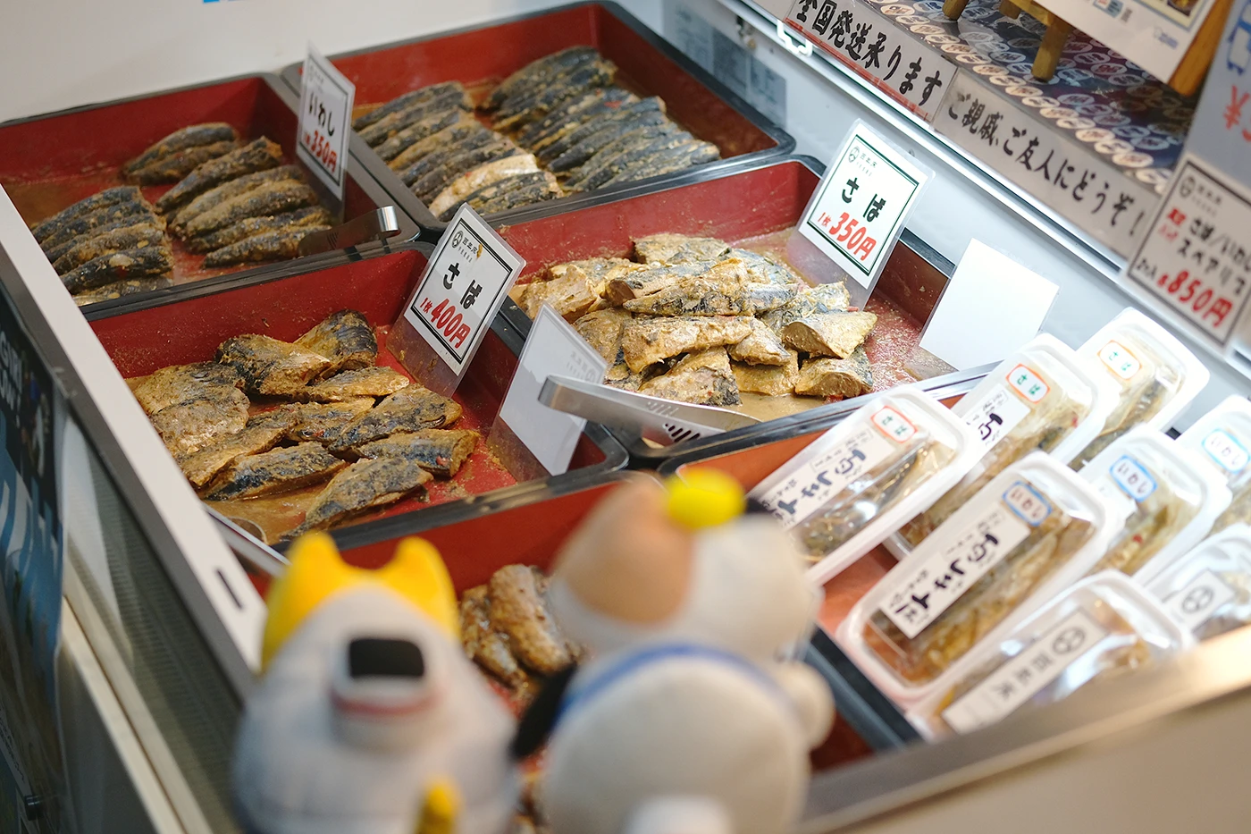 曾祖母の代から100年以上受け継がれてきたぬか床で炊いたイワシやサバは、骨まで柔らかく、甘辛い味付けがたまりません。ぬか炊き(350~400円)を買って、その場でパクリ。深い旨味とほろりとした味わいに、みけやんも感心しきりの様子でした。