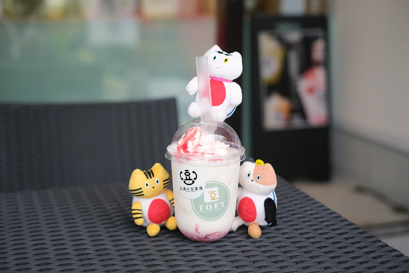 人気の「豆富ドリンク いちごミルク」(680円)は、クリーミーな豆富の食感にいちごの甘酸っぱさが重なり、まるでスイーツのような満足感!ヘルシーで罪悪感ゼロのおいしさに、せつこも大満足♡