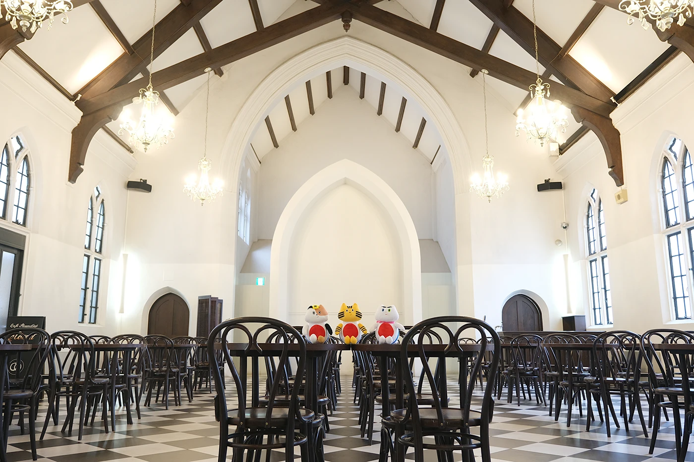 1929年に建てられたゴシック様式の建物は、今では国の登録有形⽂化財にもなっていて、重厚な⽯造りの外観や、尖塔アーチが残る礼拝堂の⾯影に、ふねこたちも静かに興奮しています。