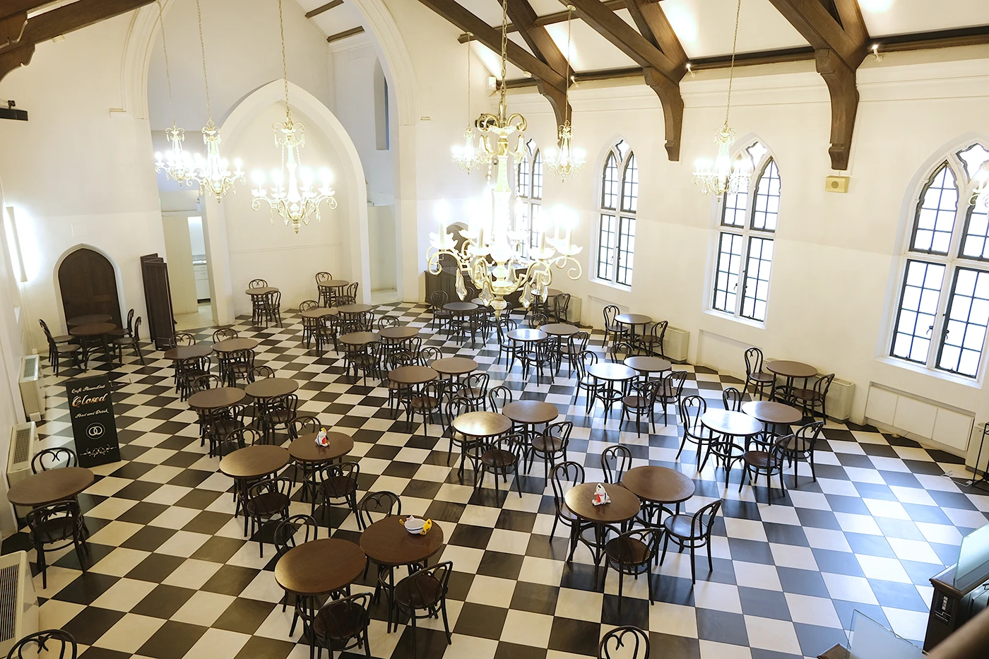階段を上がった先に広がるカフェは、かつて礼拝堂だった場所。⼤きな窓から光が差し込み、そのスケール感は思わず息を呑むほど。⽊造の構造材が作る趣あるハリ、菱形市松で彩られた床、⾼い天井と⽩い壁。ゆっくりと時間が流れる特別な空間です。
