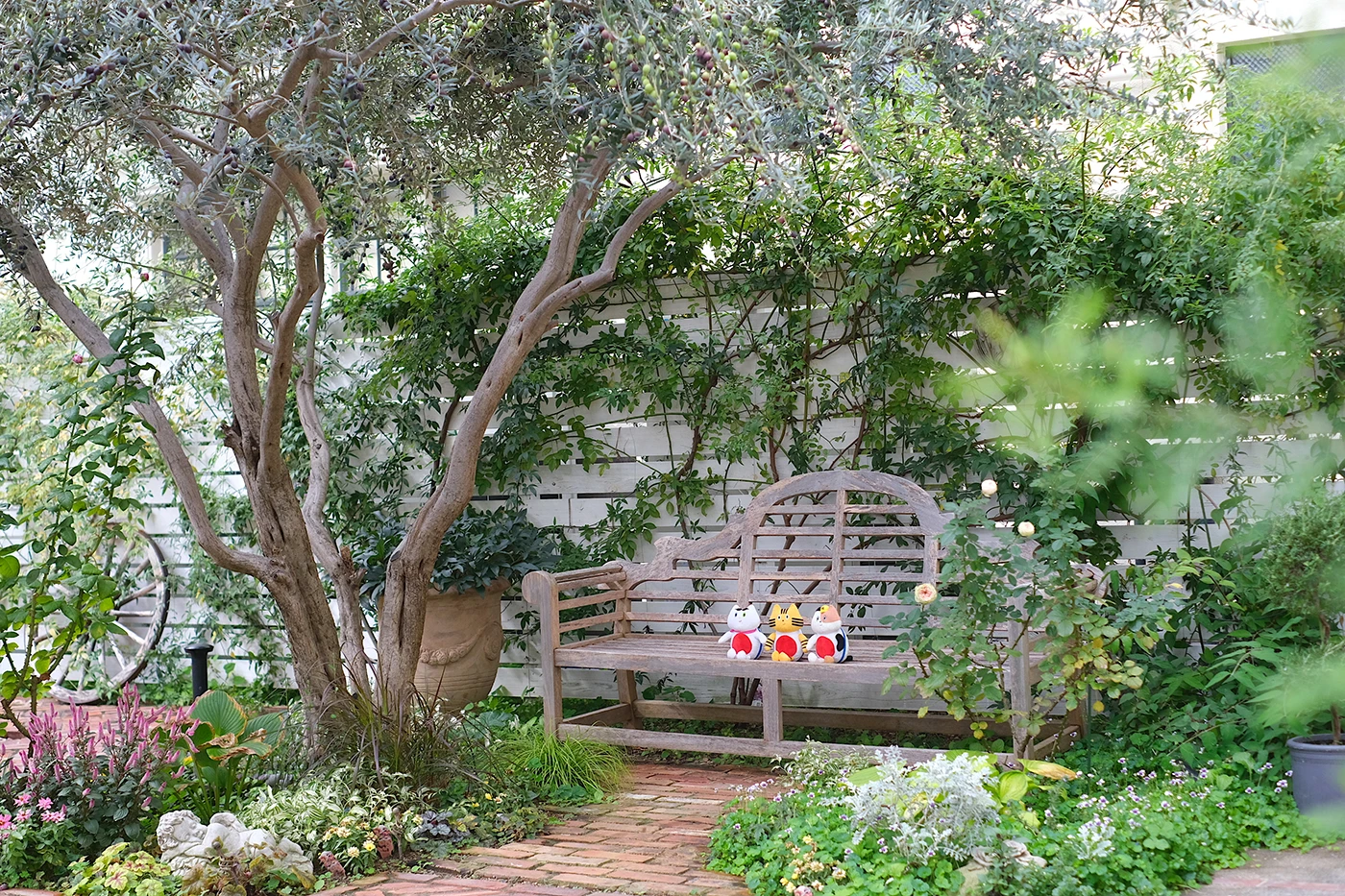 ⾷後は外の中庭へ。⼿⼊れの⾏き届いた⼩さなガーデンを眺めながら、ほっと⼀息。歴史の重なりがそのまま空気となって漂う、ここでしか味わえない特別な時間を満喫し、⽢く静かな余韻に包まれたふねこたちでした。