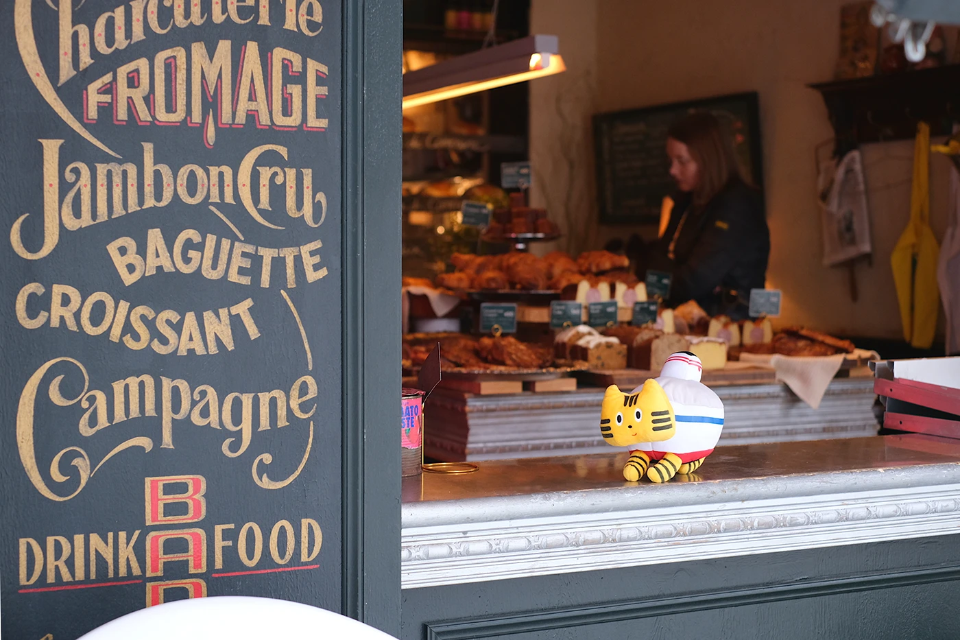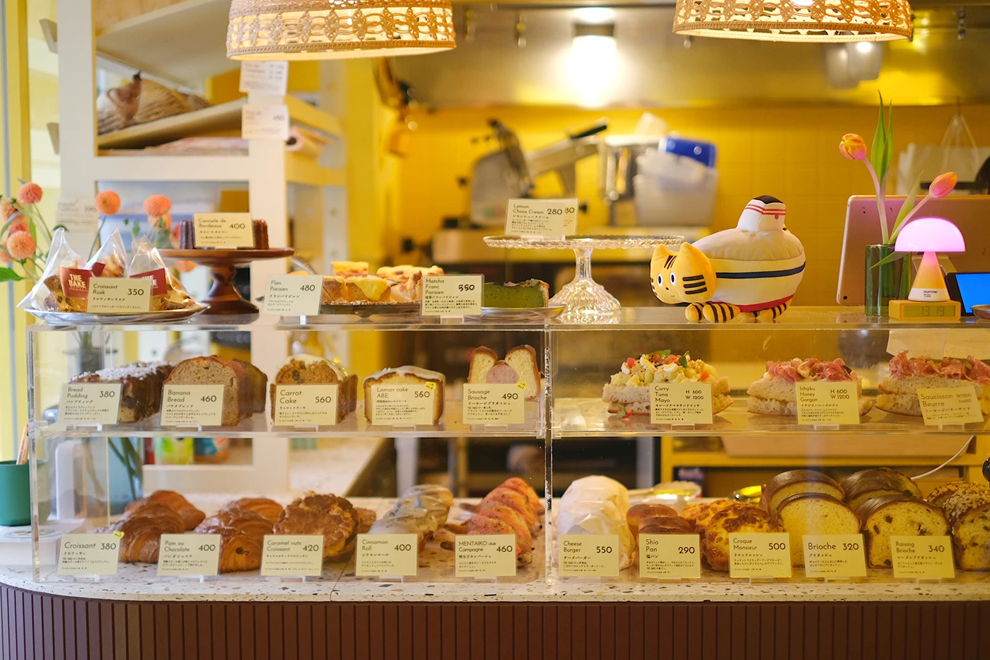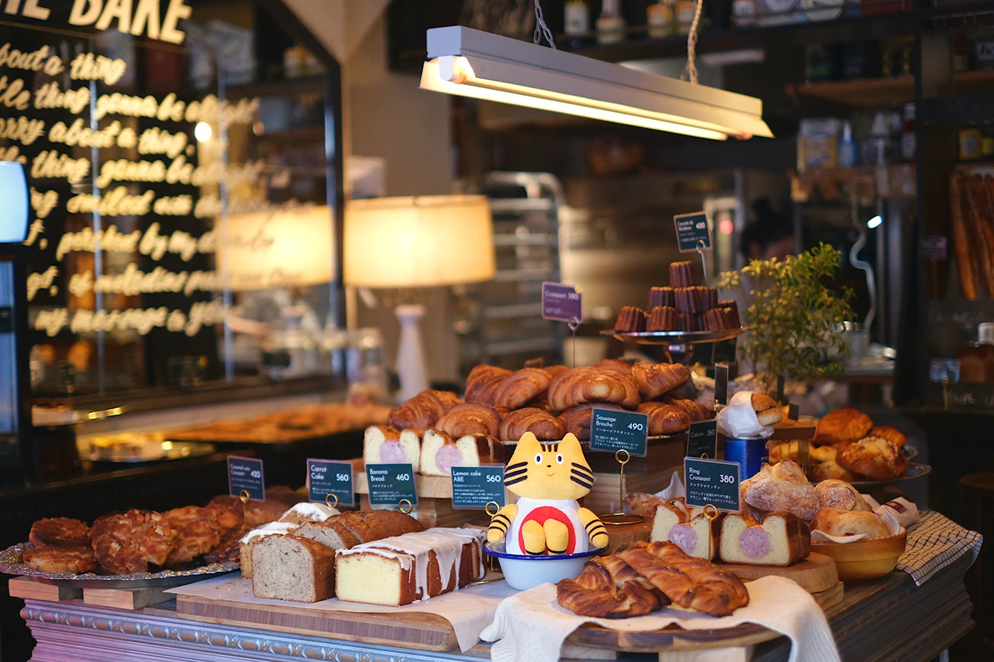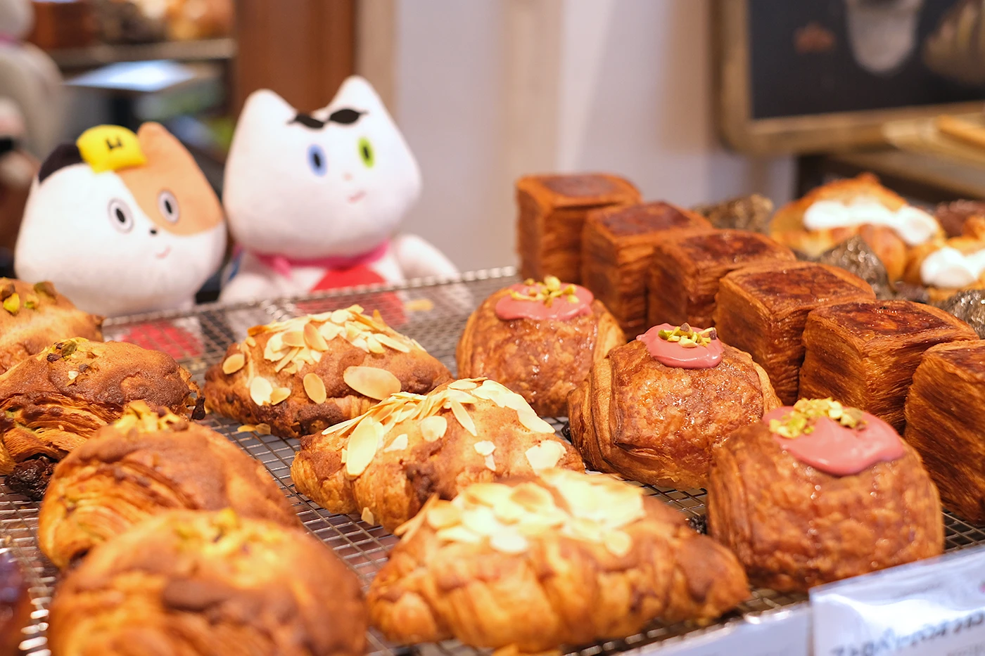 奥の厨房から、焼きたてのパンが次々と陳列棚へと運ばれていきます。キッチンの熱気と⾹ばしい⾹りが広がり、その場の臨場感にみけやんも興味津々。『THE BAKE.』では、⼀つひとつのパンを“料理として仕上げる”感覚を⼤切にしているそうで、⾃家製シャルキュトリーや旬の⾷材を⽣かした豊かな味わいが⼈気の理由。⾒た⽬も豪勢で、あれもこれも味わってみたくなります…!