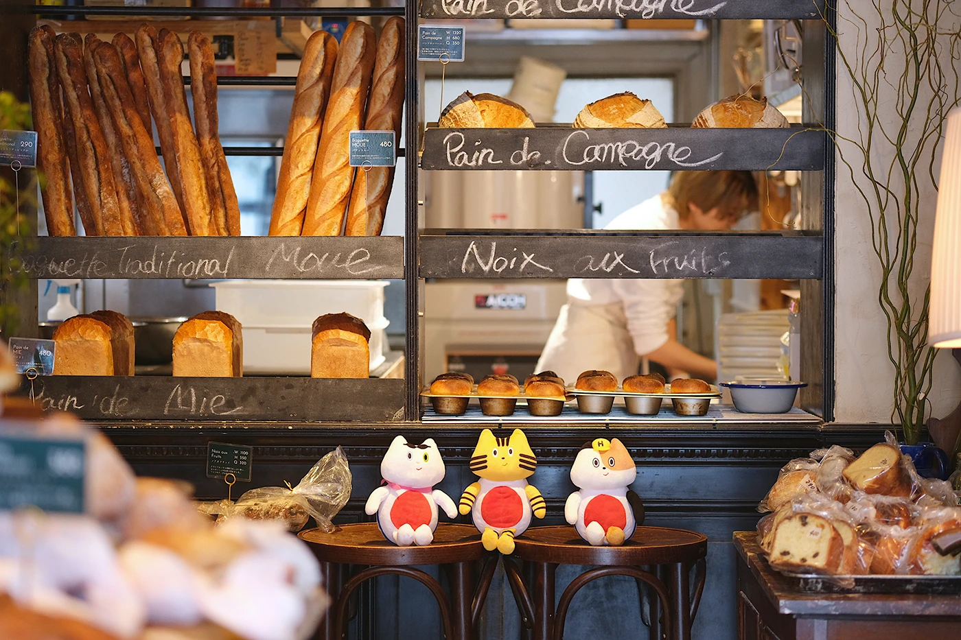 店内は、アンティークの什器が並ぶおしゃれな空間。近所に暮らす海外出⾝のお客さんの姿も多く、パンを選ぶ仕草や会話の雰囲気も相まって、なんだかヨーロッパを旅しているような空気が漂います。ヨーロッパ帰りのせつこは、パリの⼤好きなパン屋さんの⾯影と重ねているのか煌々とした眼差し♪