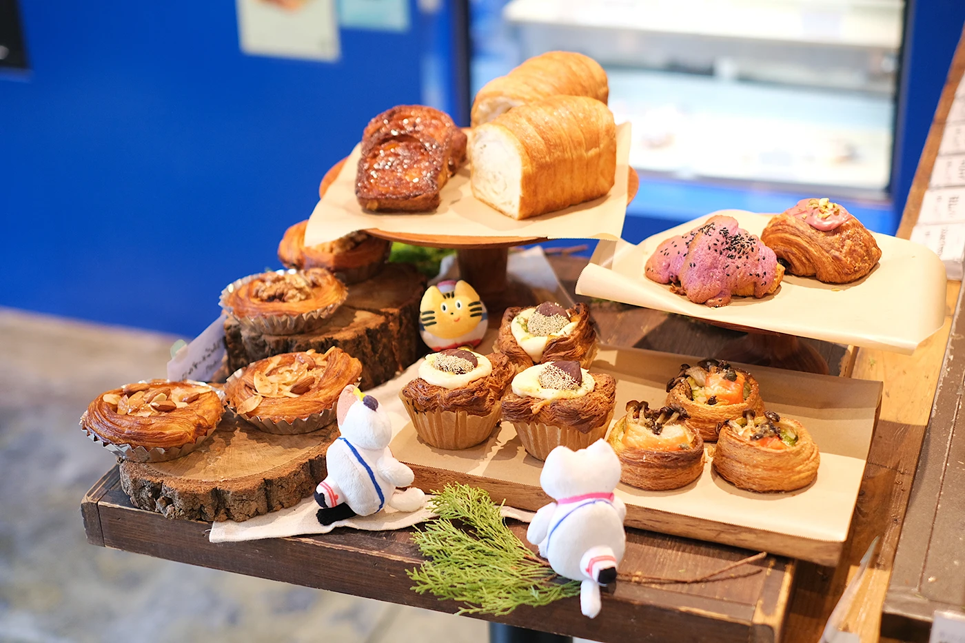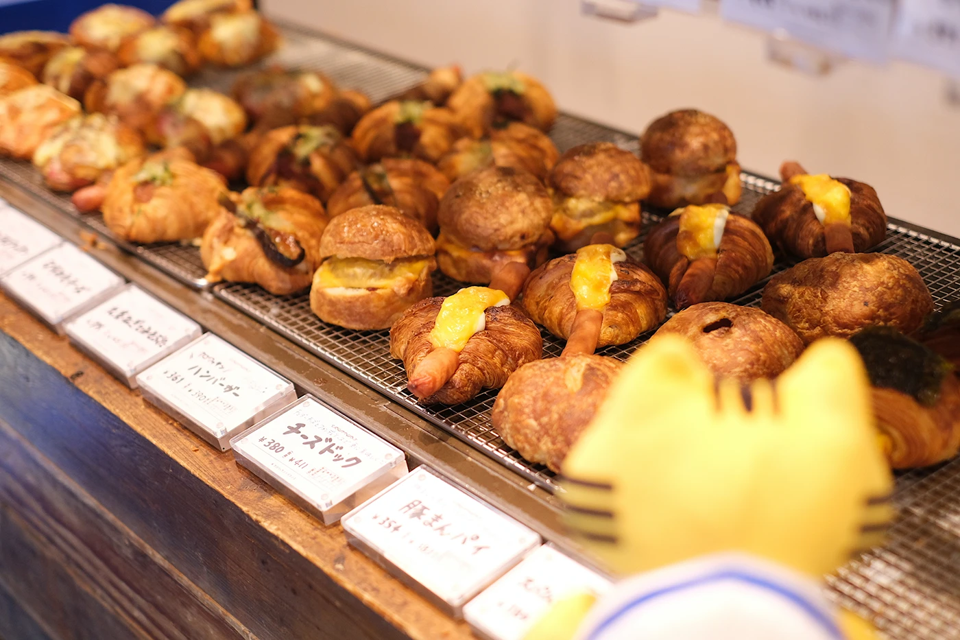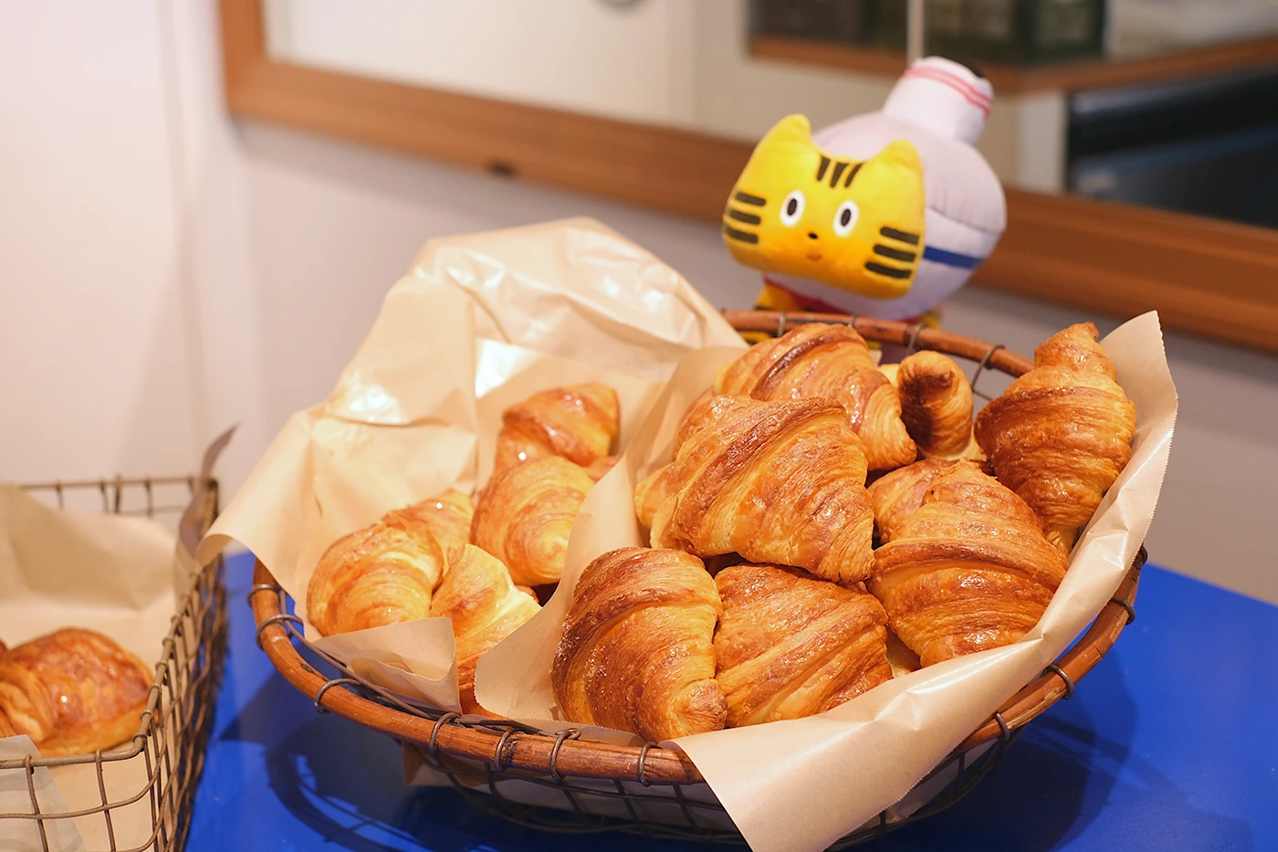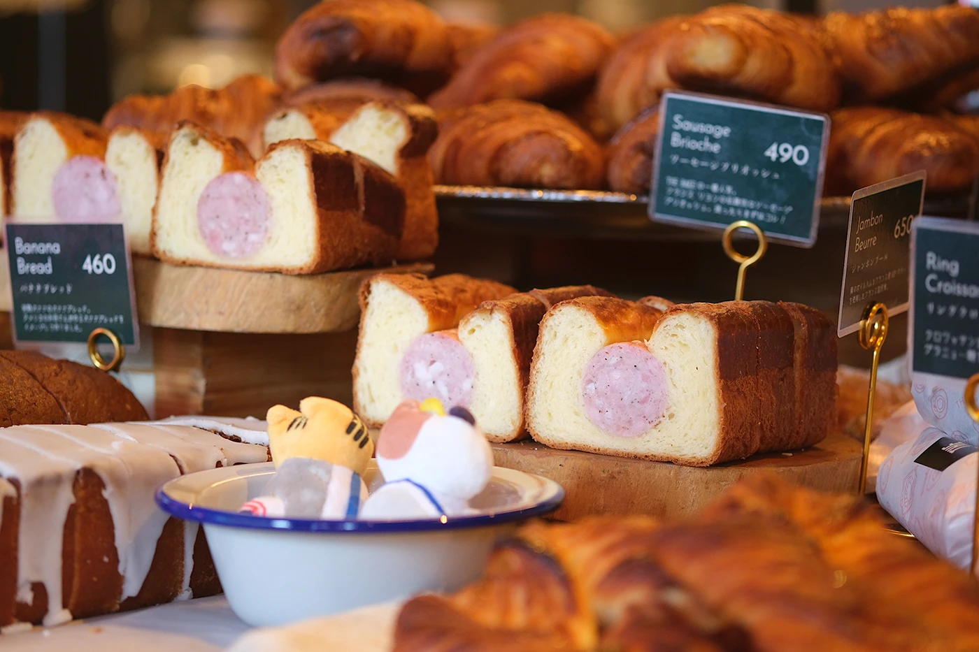 中央の⼤きなテーブルには、ボリュームたっぷりのパンがぎっしりと並び、その光景に⾷欲をくすぐられたふねこたちは思わず前のめり。⾃家製ソーセージとブリオッシュ⽣地を組み合わせた「ソーセージブリオッシュ」が看板商品なのですが、両端が猫の⽿のようにぴょんと⽴ったフォルムとソーセージの断⾯が特徴的。ふねこのまん丸のお腹とそっくりですね♡