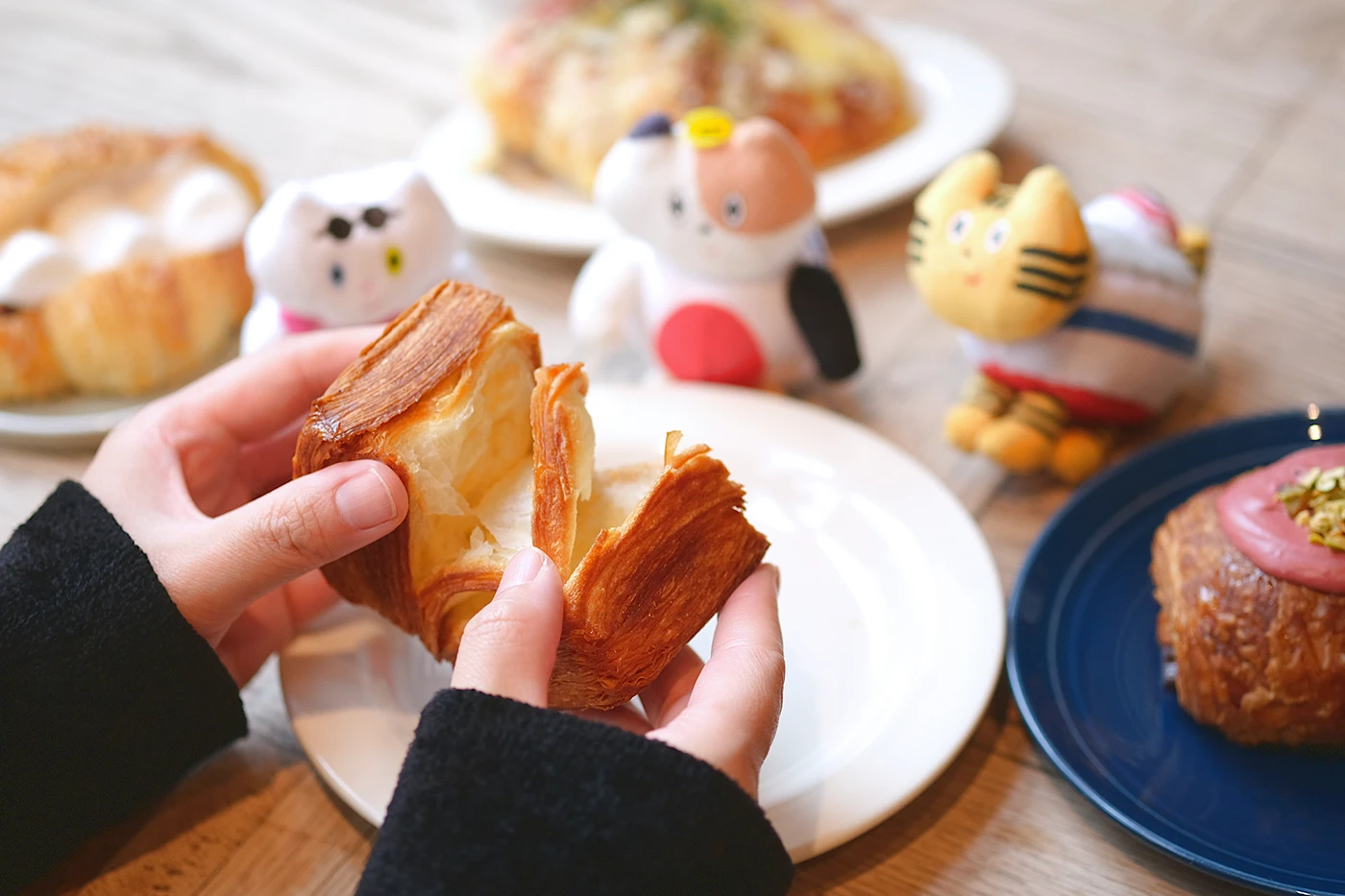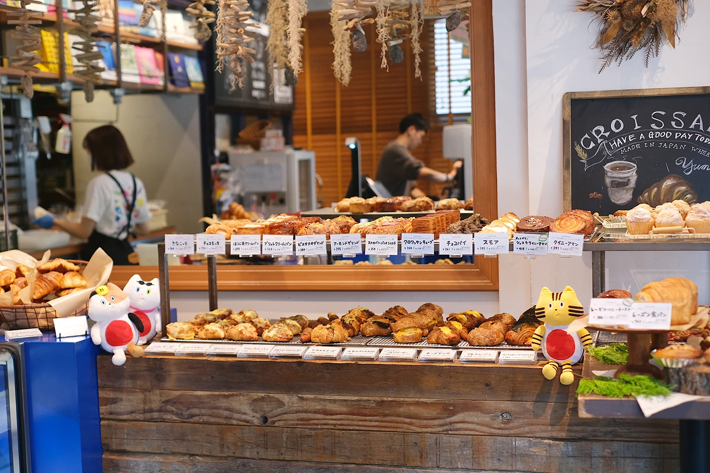 店内のイートイン席では、ふねこたちが選んだクロワッサンが並んで⼼ときめく光景に。⾹ばしいハムとチーズがとろりと絡む「クロックムッシュ」。⼈気商品「スモア」は、マシュマロのふわふわとヘーゼルチョコの濃厚な⽢みを楽しめる⼀品。「ストロベリーパンオショコラ」は、⽢酸っぱいベリーがデニッシュのような⽣地に寄り添い、3時のおやつにもぴったり。