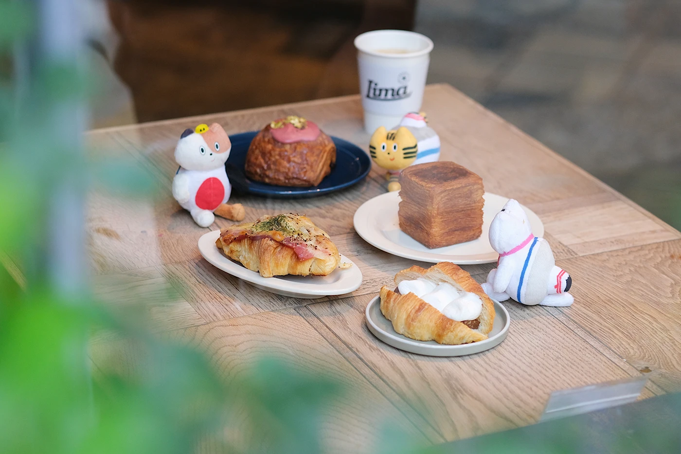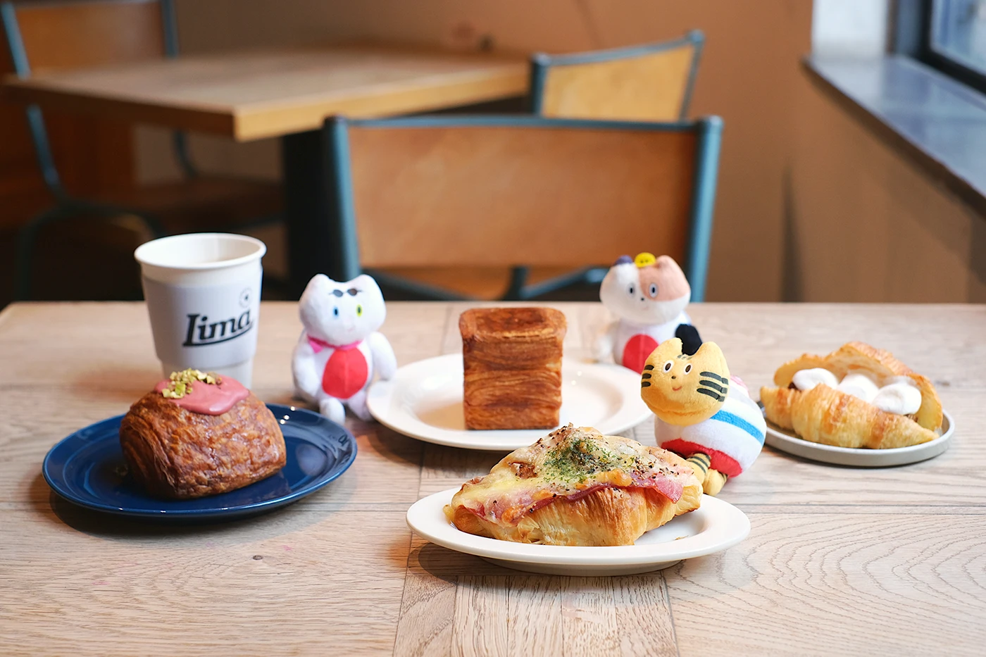 コーヒーやカフェラテは、神⼾の⼈気ロースター『LIMA COFFEE(リマコーヒー)』の⾖を使ったこだわりの⼀杯。軽やかな酸味と⾖の⾹りがクロワッサンのバターの⾵味をさらに引き⽴て、ふねこたちの午後の時間をやさしく包み込みます。⼤きな窓から差し込む⽊漏れ⽇の中で、多様なクロワッサンを頬張るひとときは、旅の途中とは思えないほどゆったりとしています♪