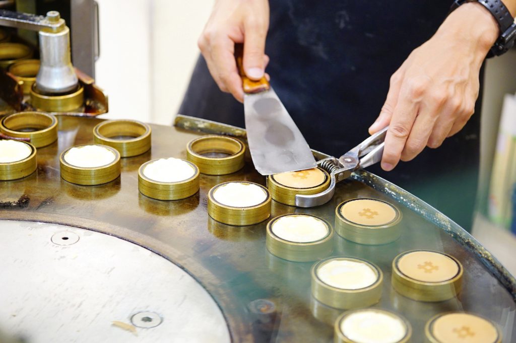 以前は「都まんじゅう」という名前で売られていたそうで、カチャカチャと製造機が音を鳴らし、生地の中に餡をとじ込めて焼き上げ、最後は井桁の焼印をつけて完成! できあがる様を眺めるのも楽しい♪
