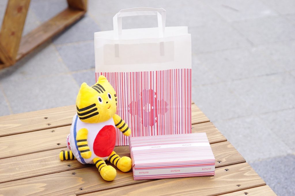井筒屋のショッピングバッグは、傘寿(80歳)祝いの色であり、小倉を象徴する紫川の「紫」と、井筒屋のロゴカラー「赤」が融合したカラーリング。さらに小倉織をモチーフにしたデザインになっているそうですよ。