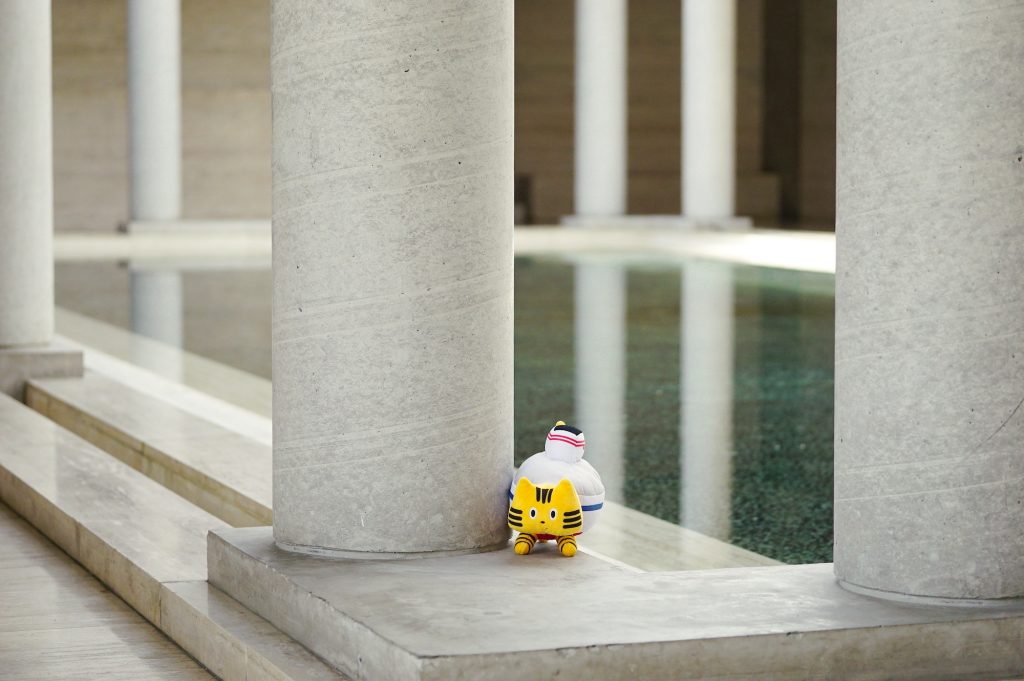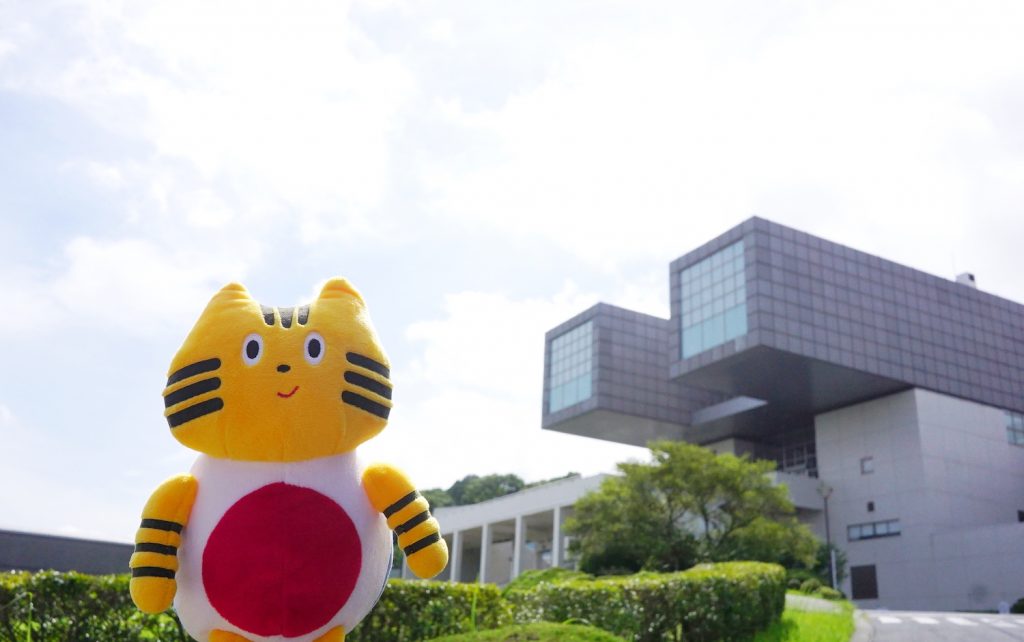 ふねこがやってきたのは、なんだかメガネのような、ロボットのような、いろんな見え方ができる個性的な外観の『北九州市立美術館』。これは建築界のノーベル賞「プリツカー建築賞」を受賞した世界的建築家・磯崎新氏が設計した建物で、1974年に開館した北九州のランドマーク的美術館です。2本の筒が突き出た特徴的な佇まいは「丘の上の双眼鏡」とも呼ばれているんですよ。