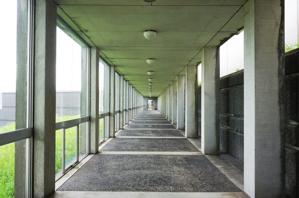 北九州市立美術館ではアート展以外に、磯崎新氏のモダニズム建築の素晴らしさを感じられるのも醍醐味。本館とアネックス棟を繋ぐ連絡通路はまっすぐのび、古代ギリシャ文化を彷彿とさせる神秘的な雰囲気。