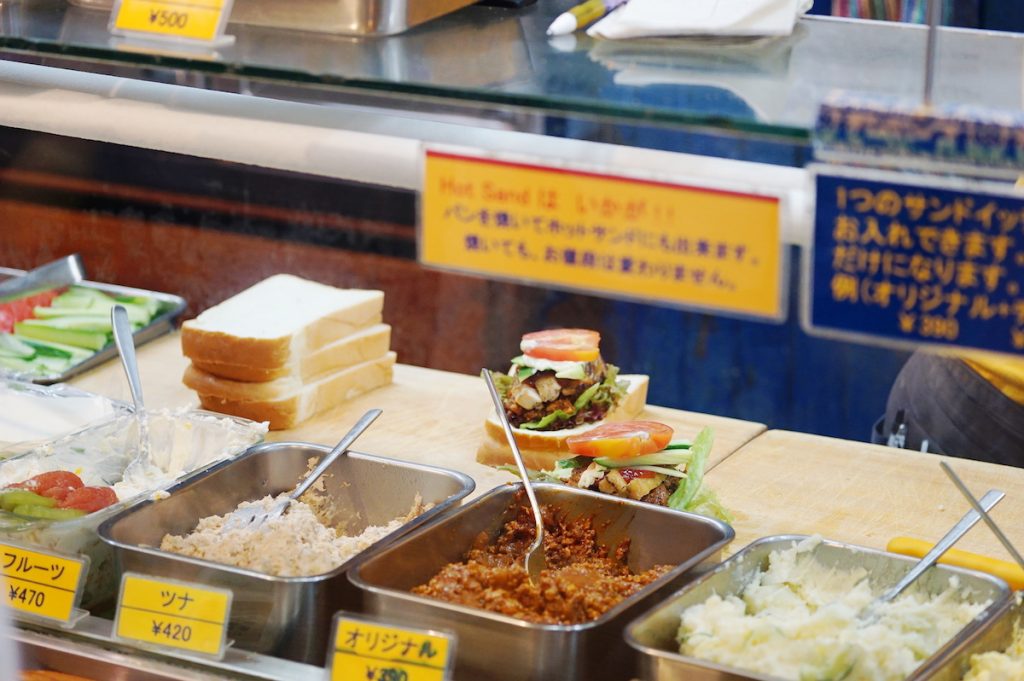 店の扉を開けると、具材がずらりと並ぶショーケースが目に飛び込んできます。これらの具材の中から気分や好みに合わせて、サンドイッチのトッピングをレジでオーダーするシステムです。