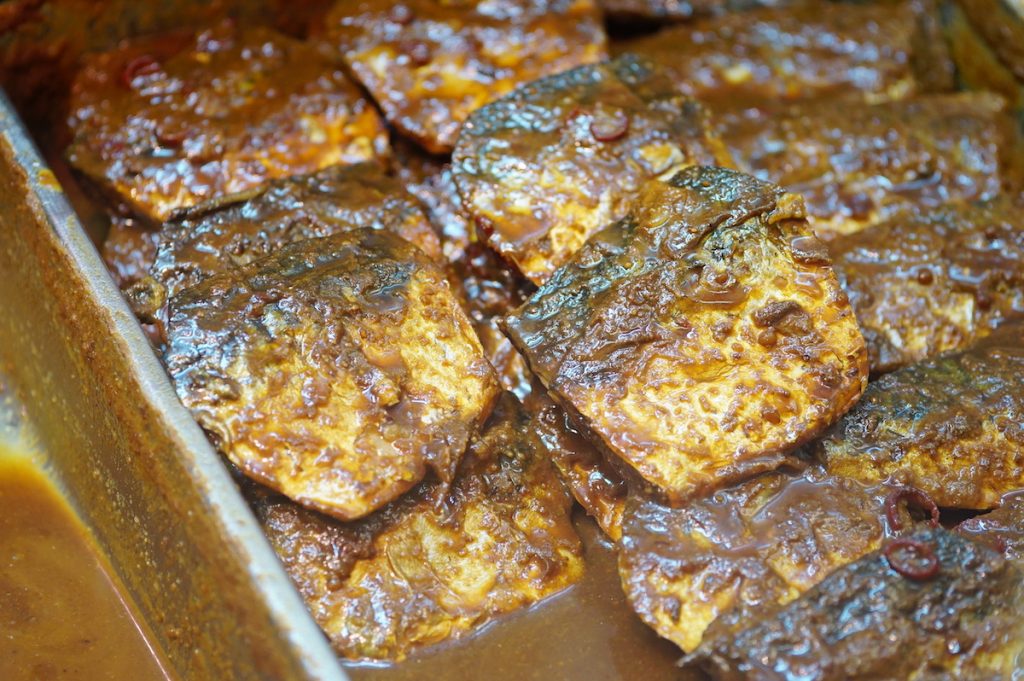ぬか味噌炊き専門店『ふじた』のお兄さんに薦めてもらって、イワシとサバの試食をパクリ♪ ほろっと柔らかく、味噌の甘味と旨味がしっかり染み込んでいてウマ〜ッ!