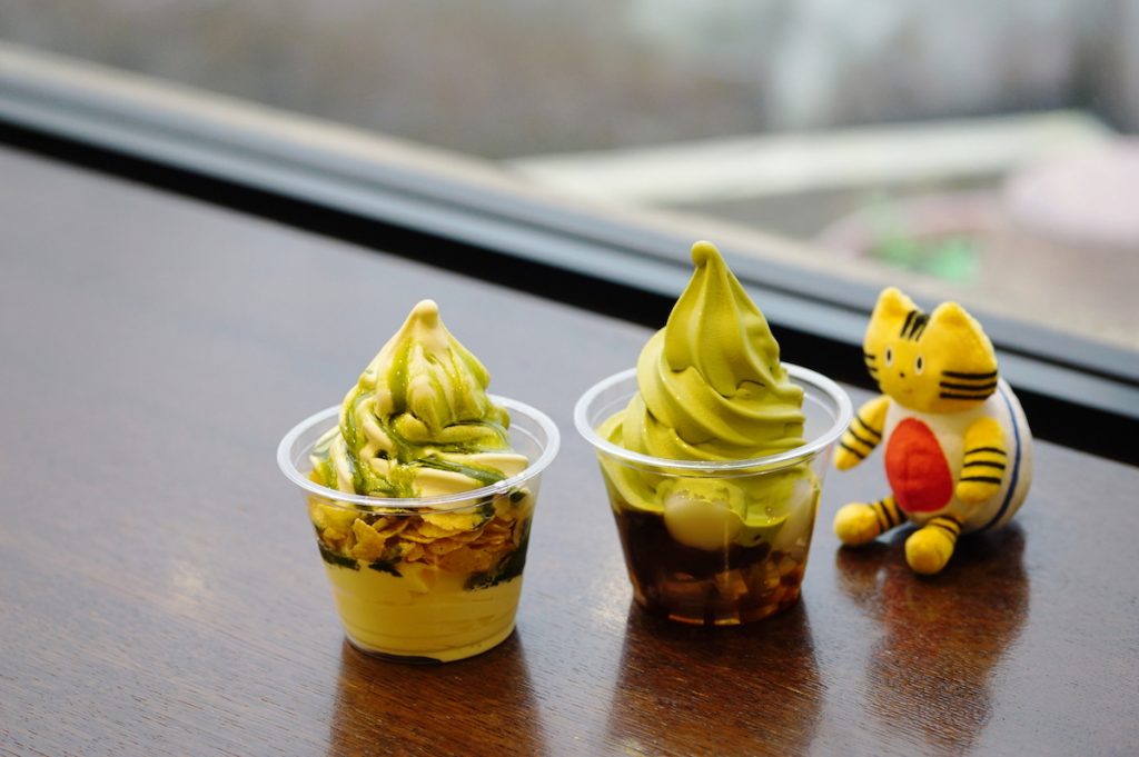 抹茶や緑茶をベースにしたラテドリンクやソフトクリーム、シフォンケーキ、シュークリームなどのカフェメニューを展開。写真左の「バニラサンデー」は、ソフトクリームの間に食感が楽しいコーンフレークをサンドした定番人気のメニュー。抹茶蜜かチョコソースを選べますが、せっかくなら抹茶蜜を選んでおきたいところ♪ 右の「抹茶白玉」は寒天とぜんざい、黒蜜、白玉、抹茶ソフトクリームを同時に味わえる欲張りなメニュー。お茶のコクと風味とともに、さまざまな食感、そして味の変化も楽しんで♪